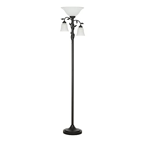- Traditional torchiere floor lamp with two reading lights in a dark bronze finish with a rustic leaf design and frosted glass shades. Ideal for adding a touch of style to any room in your home